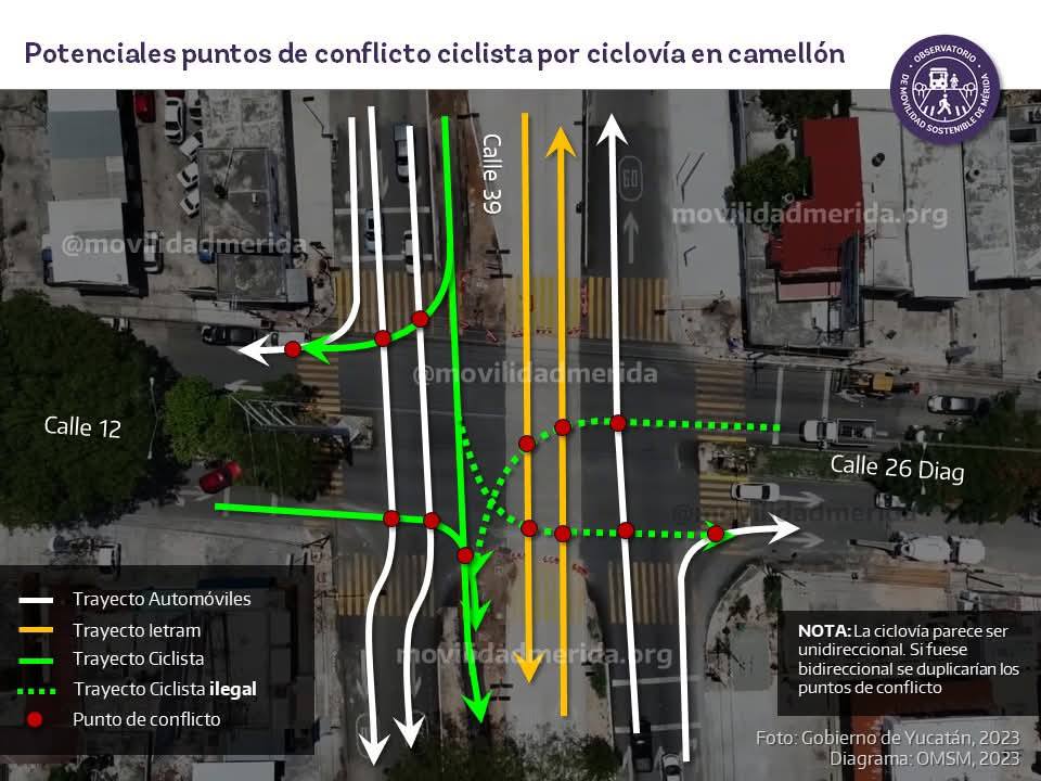 Desde hace varios años en el OMSM hemos señalado que las ciclovías en camellón NO SON VIABLES ya que se multiplican los puntos de conflicto con automovilistas en retornos e intersecciones, especialmente cuando no están semaforizadas, y hacen más difícil la incorporación y desincorporación de ciclistas a la ciclovía respecto a las calles cercanas.