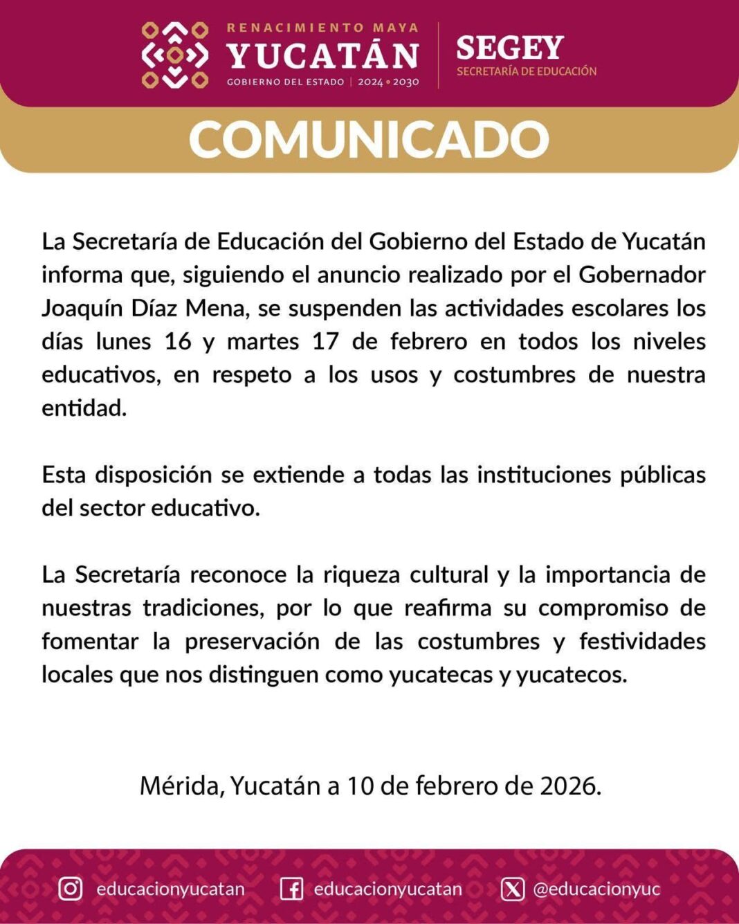 Se suspenden las actividades escolares los días lunes 16 y martes 17 de febrero en todas las instituciones públicas del sector educativo. ![]()