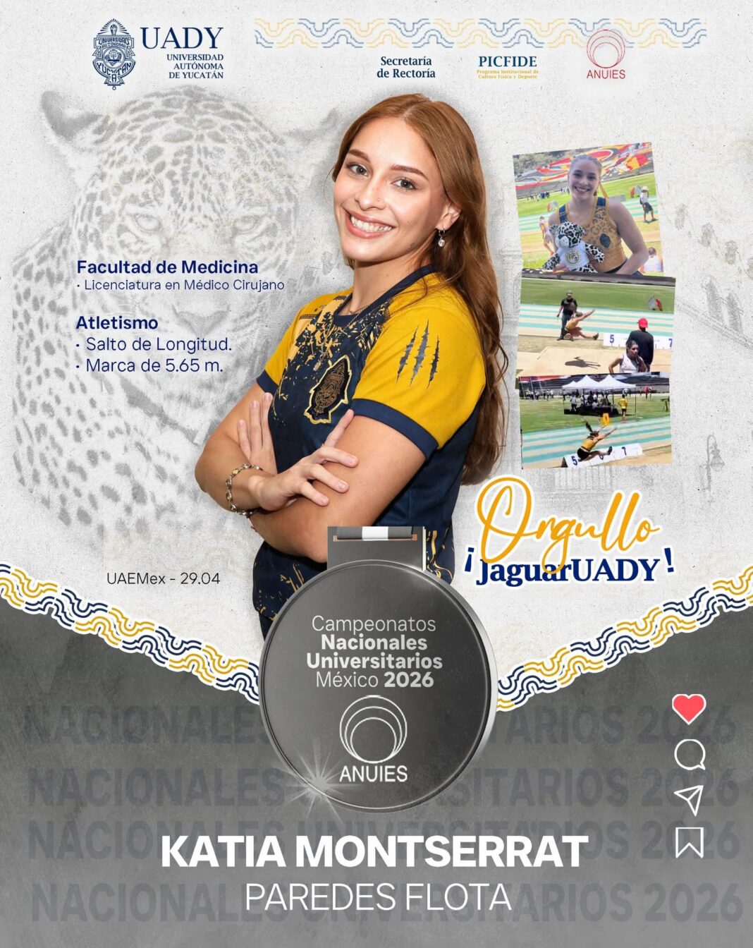 ¡Los Jaguares en Acción siguen haciendo historia en el centro del país! Anunciamos con muchísimo orgullo que Katia Montserrat Paredes Flota, estudiante de la Licenciatura en Médico Cirujano de la Facultad de Medicina, se ha colgado la medalla de plata en los Campeonatos Nacionales Universitarios ANUIES 2026.