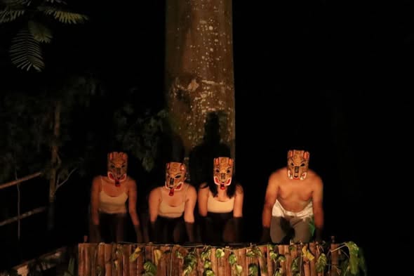 Las condiciones del espacio escénico, en medio de los árboles y el monte yucateco, favorecieron una narración en la que destacaron las voces mayas para contar la historia de Juan, el jaguar que vivió como hombre y luchó contra su propia naturaleza, la intolerancia y la incomprensión ante lo diferente.