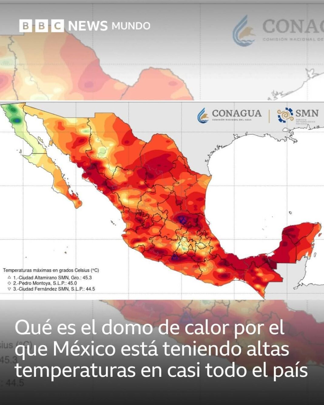 Temperaturas máximas de hasta 45 °C fueron pronosticadas para este lunes para siete estados del país -Durango, Sinaloa, Michoacán, Guerrero, Tamaulipas, San Luis Potosí y Oaxaca- y calor considerable en otras entidades que abarcan casi 90% del territorio de México.