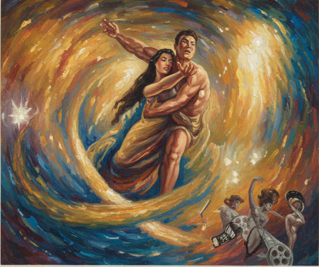 Esta obra, se plasmó en el vestíbulo del cine Aladino, ubicado en aquel entonces en la calle 60 con 65, donde antes estuvo el famosísimo edificio “EL Candado” y ahora “tiendas del sol”. La magnífica obra representa – a decir de la prensa de la época- el nacimiento de una estrella, y el centro de la composición representa a una figura femenina simbolizando a la estrella fílmica que surge del anonimato y se proyecta hacia la fama en tempestuoso abrazo que le prodiga la vigorosa forma masculina que está representando a la gigantesca industria cinematográfica contemporánea de 1957 en sus proyecciones panorámicas y de tercera dimensión realizadas en el maravilloso colorido.