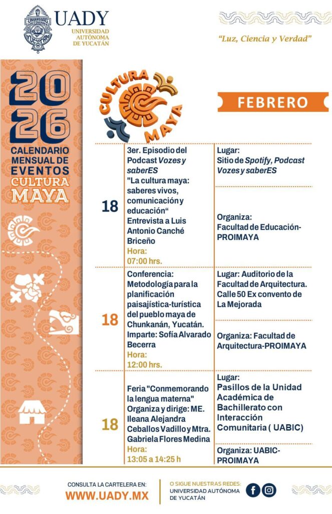 La programación también incluye actividades académicas en distintas facultades. El 20 de febrero en la Facultad de Economía, el maestro Roger Pech Sánchez impartirá la conferencia “Las matemáticas entre los mayas” a las 9:30 horas.