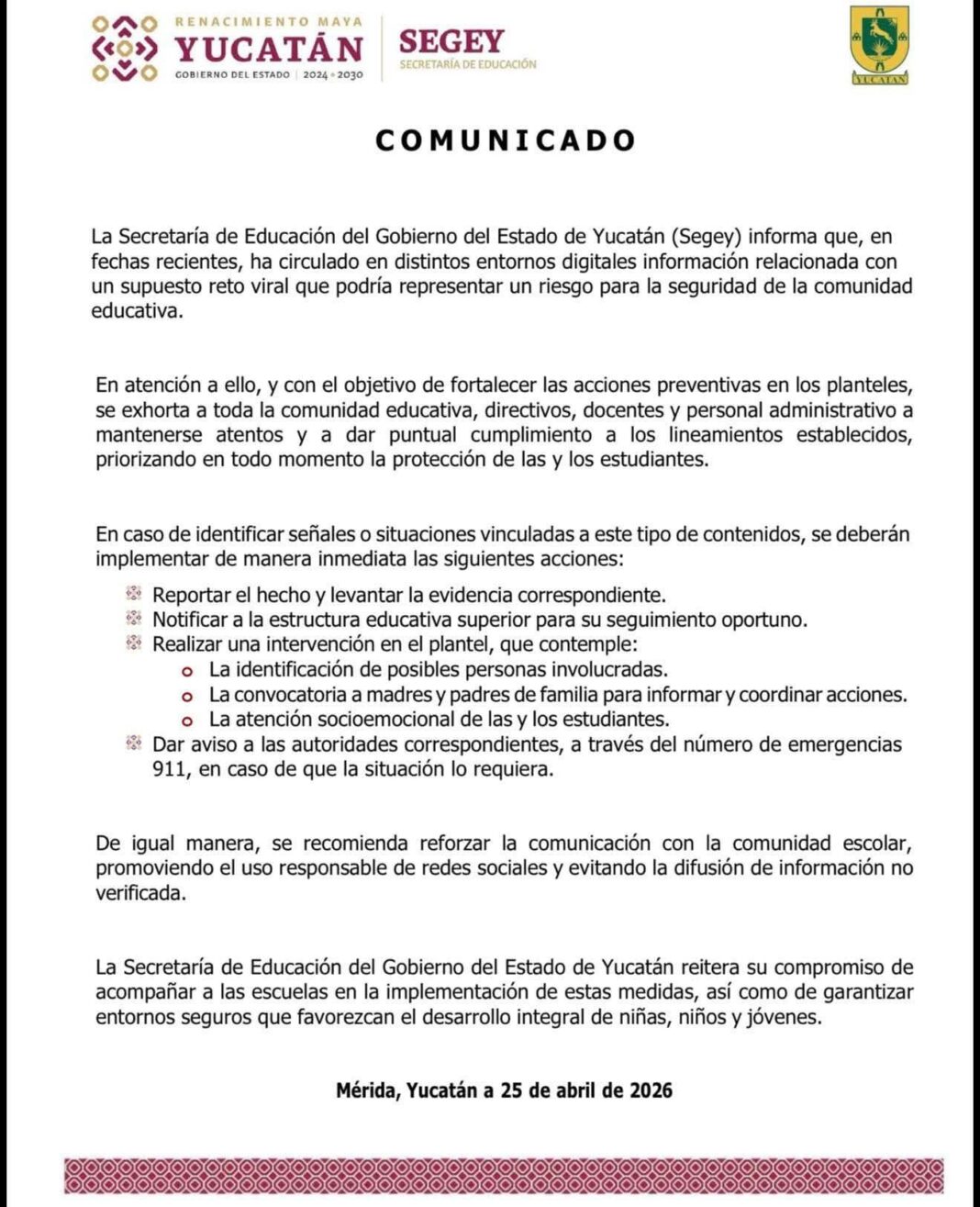 La alerta en Yucatan ha sido de parte de la Secretaría de Educación SEGEY con un comunicado en donde resalta el protocolo a seguir en casos sospechosos