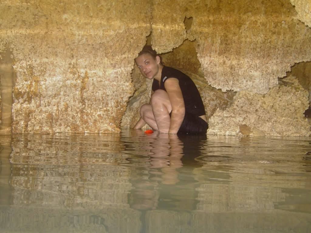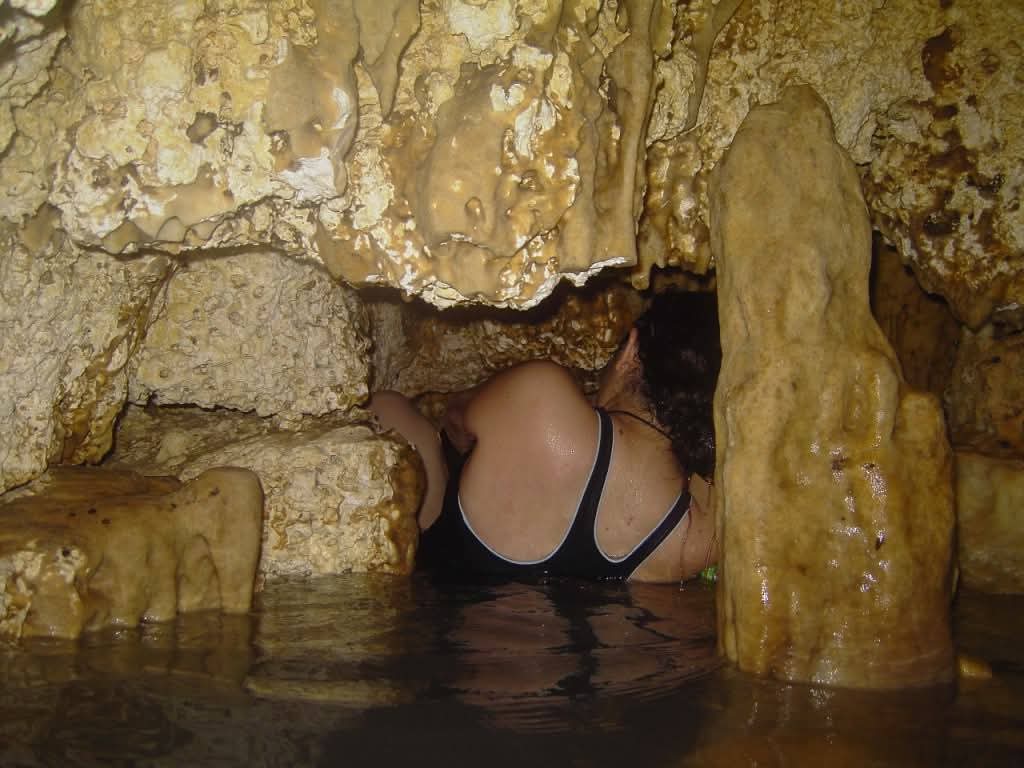 Sería muy cansado describir cada una de las partes recorridas; sólo señalo que de la bóveda principal parten dos conductos y cada uno de ellos se bifurcan por lo que dan la sensación de estar en una gruta laberíntica. Exploramos toda la caverna siempre con el cuerpo dentro el agua. Se observó la presencia de bagres negros. Otro integrante del grupo halló un tornillo como de 20 centímetros, similar a los que se pueden encontrar en las maquinarias de las viejas haciendas henequeneras. Logramos recorrer toda la cavidad y obtener un croquis a mano alzada.
